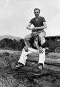 Title: Ted Smith and Elmer Clark at Prince Rupert, B. C. in 1933 Part of: Wrathall Photo Finishing Ltd. fonds Level: Item Date: 1933 Physical Description: ["1 nitrate negative : b&w ; 9 x 6.5 cm (referred to as copy 1)", "1 photograph : b&w ; 26 x 21 cm (referred to as copy 2)"] Description: Item consists of Ted Smith sits on a log, while holding up Elmer Clark up on his shoulders. A car can be seen in the background. Handwritten annotation on recto of copy 2 reads: "Ted Smith. Top - Elmer Clark. 1933. Pr. Rupert." Stamped annotation on verso of copy 2 reads: "Photo by Jack Wrathall » View details and larger image |