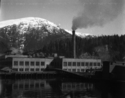 Title: Ocean Falls, B.C. in 1920 Part of: Wrathall Photo Finishing Ltd. fonds Level: Item Date: 1920 Physical Description: ["1 nitrate negative : b&w ; 10 x 13 cm (referred to as copy 1)", "1 photograph : b&w ; 11 x 13 cm (referred to as copy 2)"] Description: Item consists of a view of an industrial building in Ocean Falls, B.C. taken from the water, showing trees and mountains in the background. Stamped annotation on verso of copy 2 reads: "Photo by Jack Wrathall Prince Rupert, B. C. Ocean Falls." View details and larger image |