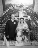 Title: Mr. and Mrs. Elmer Clausen's Wedding at Prince Rupert, B.C. in 1936 Part of: Wrathall Photo Finishing Ltd. fonds Level: Item Date: 1936 Physical Description: ["1 acetate negative : b&w ; 18 x 13 cm (referred to as copy 1)", "1 photograph : b&w ; 26 x 21 cm (referred to as copy 2)"] Description: Item consists of Elmer and Eileen Clausen (nee Mair) standing under an archway and behind a table with their wedding cake on it. Handwritten annotation on recto of copy 2 reads: "Miss Mair. Mr. & Mrs. Elmer Clauson's Wedding." Stamped annotation on verso of copy 2 reads: "Photo by Jack Wrathall » View details and larger image |
