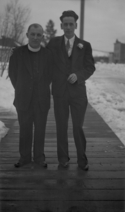 Title: Reverend Adam Crisp and Stan Brooks at Mr. and Mrs. Jack Wrathall's Wedding at Terrace B.C. on February 25, 1937 Part of: Wrathall Photo Finishing Ltd. fonds Level: Item Date: February 25, 1937 Physical Description: ["1 nitrate negative : b&w ; 15 x 8.5 cm (referred to as copy 1)", "1 photograph : b&w ; 26 x 21 cm (referred to as copy 2)"] Description: Item consists of Reverend Adam Crisp and Stan Brooks standing next to each other at the wedding of Jack and Lorna Wrathall (nee Christy). Handwritten annotation on recto of copy 2 reads: "Jack Wrathall Wedding. Rev. Adam Crisp. Stan Brooks. Terrace, B.C. Feb. 25. 1937." Stamped annotation on verso » View details and larger image |