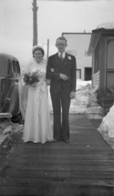 Title: Mr. and Mrs. Jack Wrathall's Wedding at Terrace B.C. on February 25, 1937 Part of: Wrathall Photo Finishing Ltd. fonds Level: Item Date: February 25, 1937 Physical Description: ["1 nitrate negative : b&w ; 15 x 8.5 cm (referred to as copy 1)", "1 photograph : b&w ; 26 x 21 cm (referred to as copy 2)"] Description: Item consists of Jack and Lorna Wrathall (nee Christy) standing outside of a house on their wedding day. Handwritten annotation on recto of copy 2 reads: "Lorna Christy. Mr. & Mrs. Jack Wrathall. Terrace, B.C. Feb. 25 - 1937." Stamped annotation on verso of copy 2 reads: "Photo by Jack Wrathall » View details and larger image |