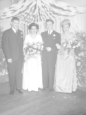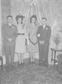 Title: Mr. and Mrs. Leonard Youngman Wedding in 1947 Part of: Wrathall Photo Finishing Ltd. fonds Level: Item Date: 1947 Physical Description: ["1 nitrate negative : b&w ; 15 x 10 cm (referred to as copy 1)", "1 photograph : b&w ; 26 x 21 cm (referred to as copy 2)"] Description: Item consists of Mary Youngman (nee Dybhavn) and Leonard Youngman standing in the middle, with a woman on their left and Bill Denlock on their right on the Youngmans wedding day. Handwritten annotation on recto of copy 2 reads: "Bill Denlock. Mr. & Mrs Youngman Wedding. 1947." Stamped annotation on » View details and larger image |