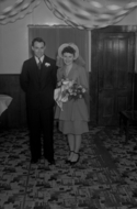 Title: Mr. and Mrs. Eric Linney's Wedding in 1945 Part of: Wrathall Photo Finishing Ltd. fonds Level: Item Date: 1945 Physical Description: ["1 nitrate negative : b&w ; 15 x 10 cm (referred to as copy 1)", "1 photograph : b&w ; 26 x 21 cm (referred to as copy 2)"] Description: Item consists of Eric Linney and his wife standing together on their wedding day. Handwritten annotation on recto of copy 2 reads: "Mr. & Mrs. Eric Linney's Wedding. 1945." Stamped annotation on verso of copy 2 reads: "Photo by Jack Wrathall Prince Rupert, B. C." View details and larger image |