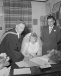 Title: Phil and Marjorie Laporte Wedding in November of 1951 Part of: Wrathall Photo Finishing Ltd. fonds Level: Item Date: November 1951 Physical Description: ["1 acetate negative : b&w ; 13 x 10 cm (referred to as copy 1)", "1 photograph : b&w ; 26 x 21 cm (referred to as copy 2)"] Description: Item consists of Marjorie Laporte (nee Shrubsall) sitting down and signing the wedding registry. Reverend Lawrence Sieber looks on from the left and husband Phil Laporte stands on the right. Handwritten annotation on recto of copy 2 reads: "Nov - 1951." Stamped annotation on verso of copy 2 reads: » View details and larger image |