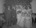 Title: Phil and Marjorie Laporte Wedding at November 1951 Part of: Wrathall Photo Finishing Ltd. fonds Level: Item Date: November 1951 Physical Description: ["1 acetate negative : b&w ; 10 x 13 cm (referred to as copy 1)", "1 photograph : b&w ; 21 x 26 cm (referred to as copy 2)", "1 photograph : b&w ; 10 x 13 cm (referred to as copy 3)"] Description: Item consists of the wedding party of Phil and Marjorie Laporte (nee Shrubsall) including one man, two women and two young girls. Pictured from left to right is: Ernie Wallace, Phil Laporte, Marjorie Laporte (nee Shrubsall), Jean Andreassen (Faught), Frances Hanson (Olafson), Mary-Jean Mall » View details and larger image |