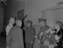 Title: Presentation to Colonel S.D. Johnston at Prince Rupert, B.C. in 1945 Part of: Wrathall Photo Finishing Ltd. fonds Level: Item Date: 1945 Physical Description: ["1 nitrate negative : b&w ; 8 x 10.5 cm (referred to as copy 1)", "1 photograph : b&w ; 21 x 26 cm (referred to as copy 2)"] Description: Item consists of a woman holding a large bouquet of flowers looks on as two men in civilian clothing make a presentation to Colonel Syd D. Johnston and another man in a military uniform. Handwritten annotation on recto of copy 2 reads: "Presentation to Col. S. D. Johntom [sic]. 1945. Prince Rupert." » View details and larger image |