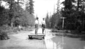 Title: Skeena River Flood of 1936 Part of: Wrathall Photo Finishing Ltd. fonds Level: Item Date: 1936 Physical Description: ["1 nitrate negative : b&w ; 6 x 10.5 cm (referred to as copy 1)", "1 photograph : b&w ; 21 x 26 cm (referred to as copy 2)"] Description: Item consists of two men on a platform during the Skeena River Flood near submerged CN railway tracks. Partially submerged hydro poles can be seen on the right. Handwritten annotation on recto of copy 2 reads: "Big Flood - Skeena River 1936." Stamped annotation on verso of copy 2 reads: "Photo by » View details and larger image |