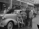 Title: Charlie Postak, Neil McDonald, George Howe and Another Man Bringing Back Their Moose at 3rd Avenue West at Prince Rupert, B.C. in 1946 Part of: Wrathall Photo Finishing Ltd. fonds Level: Item Date: 1946 Physical Description: ["1 nitrate negative : b&w ; 8 x 11 cm (referred to as copy 1)", "1 photograph : b&w ; 21 x 26 cm (referred to as copy 2)"] Description: Item consists of four men standing in front of a car with a moose strapped to the top on the 300 block of 3rd Avenue West. Pictured from left to right is: a man, Charlie Postak, Neil MacDonald and George Howe. The McRae Bros. Ltd. photography store can be seen in the background. Handwritten » View details and larger image |