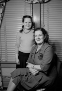 Title: Mrs. George Armstrong and Daughter in January of 1946 Part of: Wrathall Photo Finishing Ltd. fonds Level: Item Date: January 1946 Physical Description: ["1 nitrate negative : b&w ; 8.5 x 6 cm (referred to as copy 1)", "1 photograph : b&w ; 26 x 21 cm (referred to as copy 2)"] Description: Item consists of Mrs. George Armstrong sitting in a chair on the right and her daughter standing on the left as they pose for a photograph. Handwritten annotation on recto of copy 2 reads: "Mrs. Geo. Armstrong & Daughter. Jan - 1946." Stamped annotation on verso of copy 2 reads: "Photo by Jack » View details and larger image |