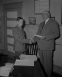 Title: Mr. Al Berner of the CNR Presenting a Cheque in 1951 Part of: Wrathall Photo Finishing Ltd. fonds Level: Item Date: August 1951 Physical Description: ["1 nitrate negative : b&w ; 13.5 x 10 cm (referred to as copy 1)", "1 photograph : b&w ; 26 x 21 cm (referred to as copy 2)"] Description: Item consists of Al Berner of C.N.R. on the right presenting a cheque to a young man standing on the left at an unknown location. Handwritten annotation on recto of copy 2 reads: "C.N.R. Mr. Al. Berner Presenting Cheque. 1951." View details and larger image |