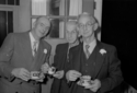 Title: Mr. and Mrs. Ed and Francis (nee Webber) King Wedding on October 5, 1952 Part of: Wrathall Photo Finishing Ltd. fonds Level: Item Date: October 5, 1952 Physical Description: ["1 nitrate negative : b&w ; 6 x 9 cm (referred to as copy 1)", "1 photograph : b&w ; 21 x 26 cm (referred to as copy 2)"] Description: Item consists of Mr. Webber, a man and Mr. King at the wedding of Ed and Frances (nee Webber) King. Handwritten annotation on recto of copy 2 reads: "1 - Mr. Webber. 2. 3. Mr. King. At Mr. & Mrs. King's Wedding. Oct - 5 - 1952." Stamped annotation on verso of copy 2 reads: "Photo by Jack Wrathall » View details and larger image |