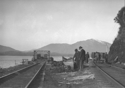 Title: Men on Tracks & Ferry Ship Rail Barge 1908 Part of: Dr. R. Geddes Large fonds Level: Item Date: 1908 Physical Description: ["1 photograph : b&w ; 21 x 26 cm ; (referred to as copy 1)", "1 photograph : b&w ; 21 x 26 cm ; (referred to as copy 2)", "1 nitrate negative : b&w ; 10 x 16 cm ; (referred to as copy 3)"] Description: Photograph depicts men working on railway tracks including two men moving barrels on a railway cart. A rail barge can be seen in the background. Mountains can also be seen in the background. View details and larger image |