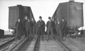 Title: Eight Men on GTP Tracks Part of: Dr. R. Geddes Large fonds Level: Item Date: 1908 Physical Description: ["1 photograph : b&w ; 21 x 26 cm ; (referred to as copy 1)", "1 photograph : b&w ; 21 x 26 cm ; (referred to as copy 2)", "1 nitrate negative : b&w ; 10 x 15 cm ; (referred to as copy 3)"] Description: Photograph depicts eight GTP officials standing on Grand Trunk Pacific railway tracks and in front of two railway cars. View details and larger image |