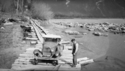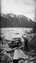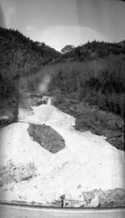 Title: George Thompson Driving a Car Around the Snowslide at Kwinitsa Tunnel While George Attrill Watches in 1945 Part of: Wrathall Photo Finishing Ltd. fonds Level: Item Date: 1945 Physical Description: ["1 nitrate negative : b&w ; 6 x 10.5 cm (referred to as copy 1)", "1 photograph : b&w ; 21 x 26 cm (referred to as copy 2)"] Description: Item consists of George Attrill standing on wooden roadway while George Thompson from Shames Mill tries to drive a car. Thompson is trying to drive around the snowslide at Kwinitsa Tunnel. The Skeena River can be seen on the right and hydro poles can be seen on the left. Handwritten annotation on » View details and larger image |