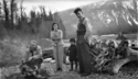 Title: Four People Having a Picnic on the shore of the Skeena River Part of: Wrathall Photo Finishing Ltd. fonds Level: Item Date: [ca. 1945] Physical Description: 1 nitrate negative : b&w ; 6.5 x 11 cm Description: Item consists of two men, a woman and child having a picnic along the Skeena River. The man pictured farthest on the left is Jack Wrathall. Mountains can be seen in the background. View details and larger image |