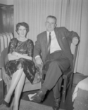 Title: Mr. & Mrs. Ken and Evelyn Aird at a Party in 1963 Part of: Wrathall Photo Finishing Ltd. fonds Level: Item Date: February 1, 1963 Physical Description: ["1 acetate negative : b&w ; 14 x 10 cm (referred to as copy 1)", "1 photograph : b&w ; 26 x 21 cm (referred to as copy 2)"] Description: Item consists Ken Aird sitting next to his wife Evelyn Aird at a party held by Marilyn Anderson at an unknown location. Handwritten annotation on recto of copy 2 reads: "Mr. & Mrs. Ken Aird. Feb. 1 - 1963." Stamped annotation on verso of copy 2 reads: "Photo by Jack Wrathall Prince Rupert, B. C." View details and larger image |