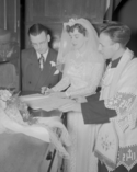 Title: Johnny & Vivian's Wedding Part of: Wrathall Photo Finishing Ltd. fonds Level: Item Date: 1953 Physical Description: 1 acetate negative : b&w ; 14 x 10 cm Description: Item consists of Johnny Comadina, on the left, and Vivian Wrathall, in the center, with a priest, on the right, at their wedding. Vivian can be seen signing the marriage certificate. View details and larger image |