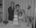 Title: Ken Wrathall & Mary Davidson Wedding Part of: Wrathall Photo Finishing Ltd. fonds Level: Item Date: 1951 Physical Description: 1 acetate negative : b&w ; 14 x 11 cm Description: Item consists of two children, a man and a woman standing behind a cake at the wedding of Ken Wrathall and Mary Davidson. Another woman can also be seen on the left. View details and larger image |