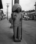 Title: Wooden Indigenous Man at Prince Rupert, BC in 1946 Part of: Wrathall Photo Finishing Ltd. fonds Level: Item Date: 1946 Physical Description: ["1 nitrate negative : b&w ; 12 x 9.5 cm", "1 photograph : b&w ; 26 x 21 cm"] Description: Item consists of a carved wooden Indigenous man wearing a headdress in front of Manson's Jewellers on 3rd Avenue West. Handwritten annotation on recto reads: "Wooden Indian Prince Rupert, B. C." View details and larger image |