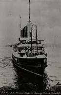 Title: SS "Prince Rupert" Leaving Prince Rupert, B.C. in 1910 Part of: Wrathall Photo Finishing Ltd. fonds Level: Item Date: 1910 Physical Description: 2 photographs : b&w ; 18 x 12 cm Description: Item consists of the GTP ship SS "Prince Rupert" leaving the Prince Rupert harbour. Handwritten annotation on recto reads: "G.T.P., S.S. Prince Rupert leaving Prince Rupert B.C. 1910." Stamped annotation on verso reads: "Photo by Jack Wrathall Prince Rupert, B. C." View details and larger image |