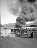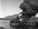 Title: Boat on Fire at Home Oil Co. at Prince Rupert, B.C. on May 23, 1947 Part of: Wrathall Photo Finishing Ltd. fonds Level: Item Date: May 23, 1947 Physical Description: ["1 nitrate negative : b&w ; 7.5 x 10 cm (referred to as copy 1)", "1 photograph : b&w ; 21 x 26 cm (referred to as copy 2)"] Description: Item consists of firemen dousing a boat fire at Home Oil Company along the waterfront. The wharf itself is also on fire. Handwritten annotation on recto of copy 2 reads: "Boat on Fire. Home Oil Co. Pr. Rupert, B.C. May 23 - 1947." Stamped annotation on verso of copy 2 reads: "Photo by Jack Wrathall » View details and larger image |